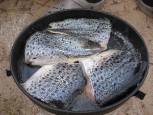 Iltapäivän lopulla nälkä hiipi jo pikku hiljaa kalamiesten vatsaan ja niinpä aloitettiin päivällisen valmistelut. Kalat savustuivat miesten keskustellessa kalastuksesta ja muista päivän polttavista asioista. Päivällinen tarjoiltiin päämökissä sisältäen tuoretta syväjärvestä pyydettyä savukalaa, keitettyjä perunoita, salaattia sekä tilanteeseen sopivaa raikasta valkoviiniä. Ruoka ja tunnelma oli avoin ja lämminhenkinen ja pöydän antimet tyhjenivät hyvinkin nopeasti. Tarjottavat olivat osallistujien mieliin pitkän kalastus- ja ulkoilupäivän jälkeen. Mauri oli jo ahkerana saunamajurina esilämmittänyt saunan ennen ruokailua ja näin olleen pääsimme herkullisen aterian jälkeen jatkamaan keskusteluja löylyjen keskelle. Löylyt olivatkin oikein makoisat ja saunomista kesti aina iltamyöhään asti. Jälkilöylyjä jatkettiin vielä laavulla nauttien  virvokkeita ja pientä huikopalaa itse kukin. Kalastuspäivä oli varmasti kaikkien mielestä ollut hieno ja myös puitteet olivat varsin tarkoitustaan palvelevat. Tästä oli hyvä jatkaa kohti seuraavaa päivää.